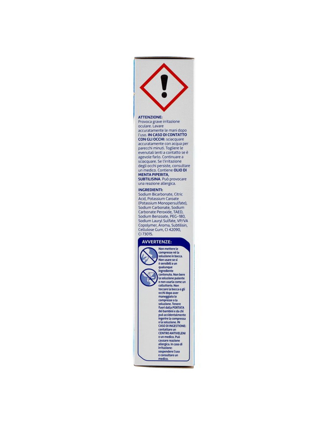 Causa grave irritazione agli occhi. Non mettere la compressa né la soluzione in bocca. Tenere fuori dalla portata dei bambini e di chi potrebbe ingerirla accidentalmente. In caso di contatto con gli occhi: sciacquare accuratamente con acqua per parecchi minuti; rimuovere le lenti a contatto se presenti e continuare a risciacquare. Se l'irritazione persiste, consultare un medico. In caso di ingestione: contattare un centro antiveleni o un medico. Non usare in caso di ipersensibilità verso uno o più componenti.