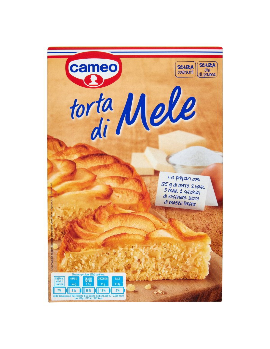 ingredienti: Farina di grano tenero tipo 0, zucchero, amido di mais, agenti lievitanti (difosfati, carbonati di sodio), sale, aromi. Può contenere grano, latte, uova, frutta a guscio, soia.