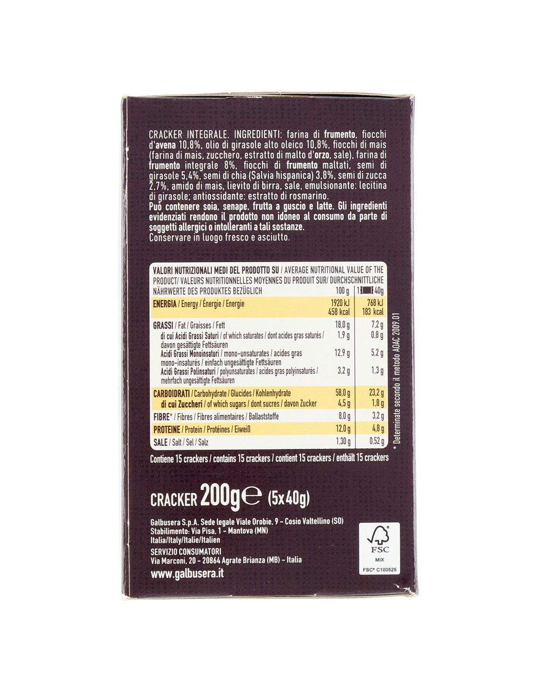Ingredienti: Farina di frumento, Fiocchi d'avena 10,8%, Olio di girasole alto oleico 10,8%, Fiocchi di mais (farina di mais, zucchero, estratto di malto d'orzo, sale), Farina di frumento integrale 8%, Fiocchi di frumento maltati, Semi di girasole 5,4%, Semi di chia (Salvia hispanica) 3,8%, Semi di zucca 2,7%, Amido di mais, Lievito di birra, Sale, Emulsionante: lecitina di girasole, Antiossidante: estratto di rosmarino. Può contenere soia, senape, frutta a guscio e latte.
