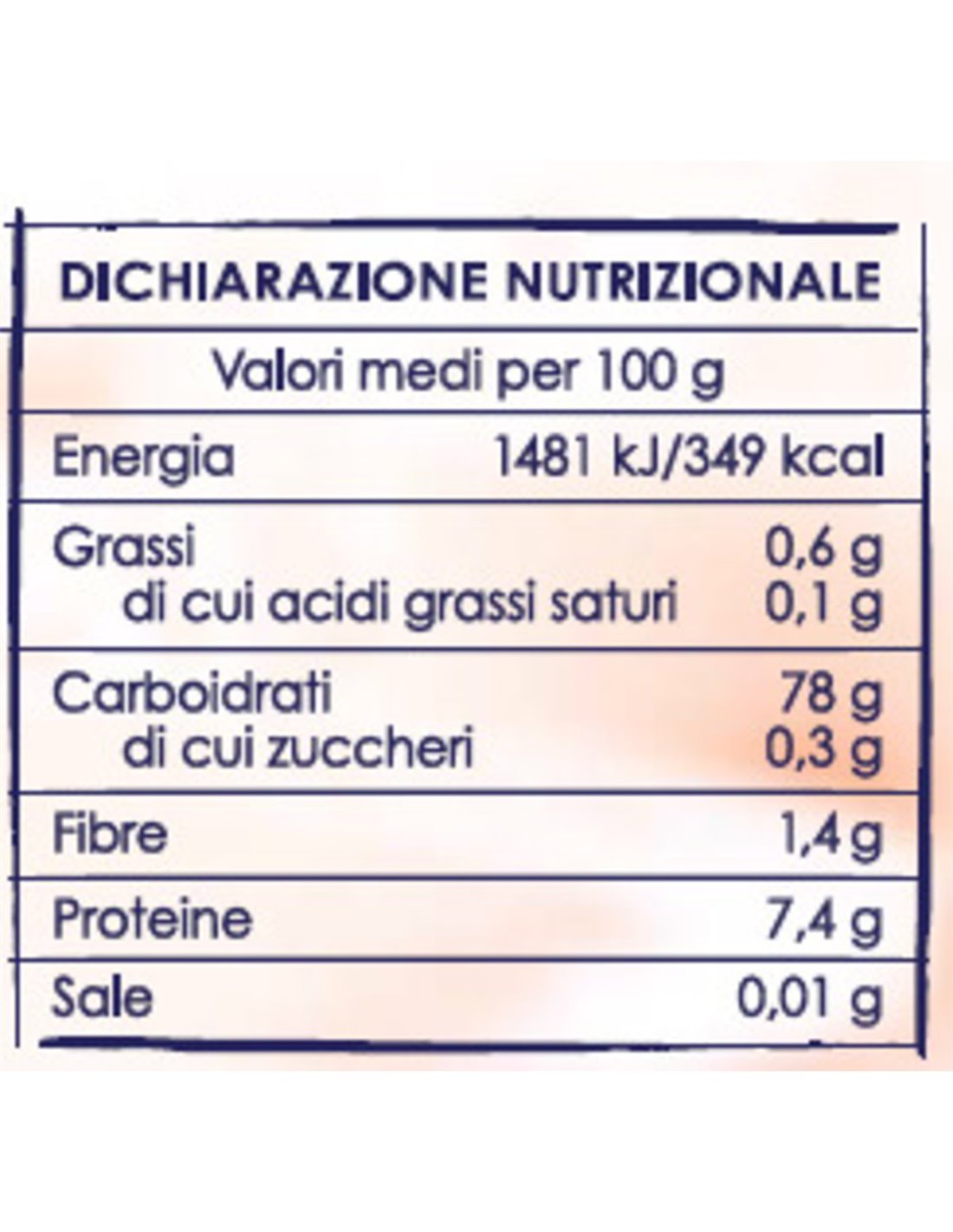 Energia: 1481 kJ / 349 kcal | Grassi: 0,6 g | Saturi: 0,1 g | Carboidrati: 78 g | Zuccheri: 0,3 g | Fibre: 1,4 g | Proteine: 7,4 g | Sale: 0,01 g