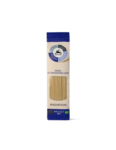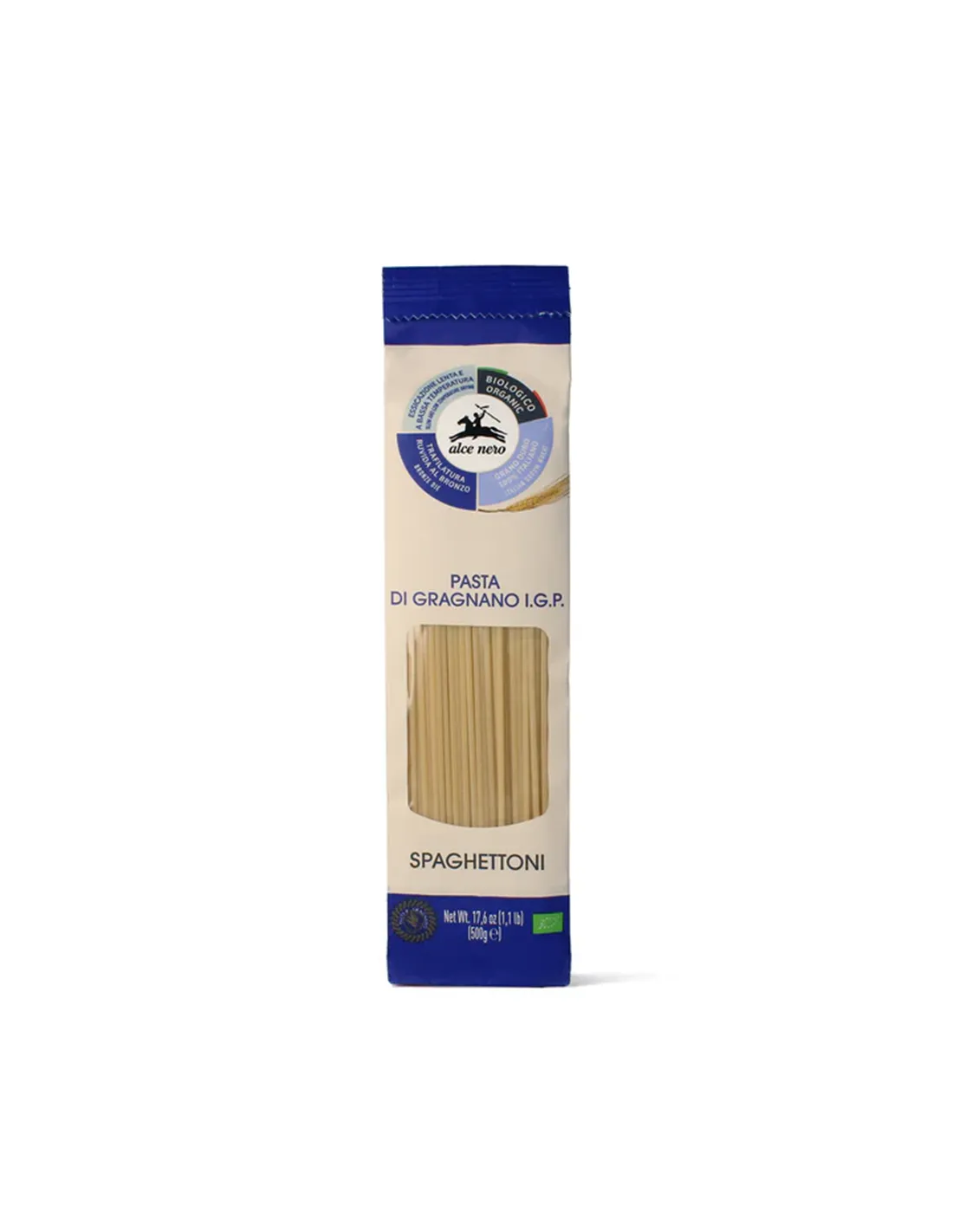 Porta in tavola l'eccellenza della tradizione artigianale con questi Spaghettoni di Gragnano. Realizzati con semola di grano duro biologico e acqua di sorgente locale, la loro lavorazione con trafila al bronzo e l'essiccazione lenta conferiscono alla pasta una superficie porosa e una consistenza unica, che cattura e esalta ogni condimento. La certificazione I.G.P. (Indicazione Geografica Protetta) è una garanzia di qualità e legame con il territorio. Ideali per ricette classiche come sughi a base di pomodoro, ma anche con salse più corpose, questi spaghettoni offrono un'esperienza di gusto autentica e appagante.