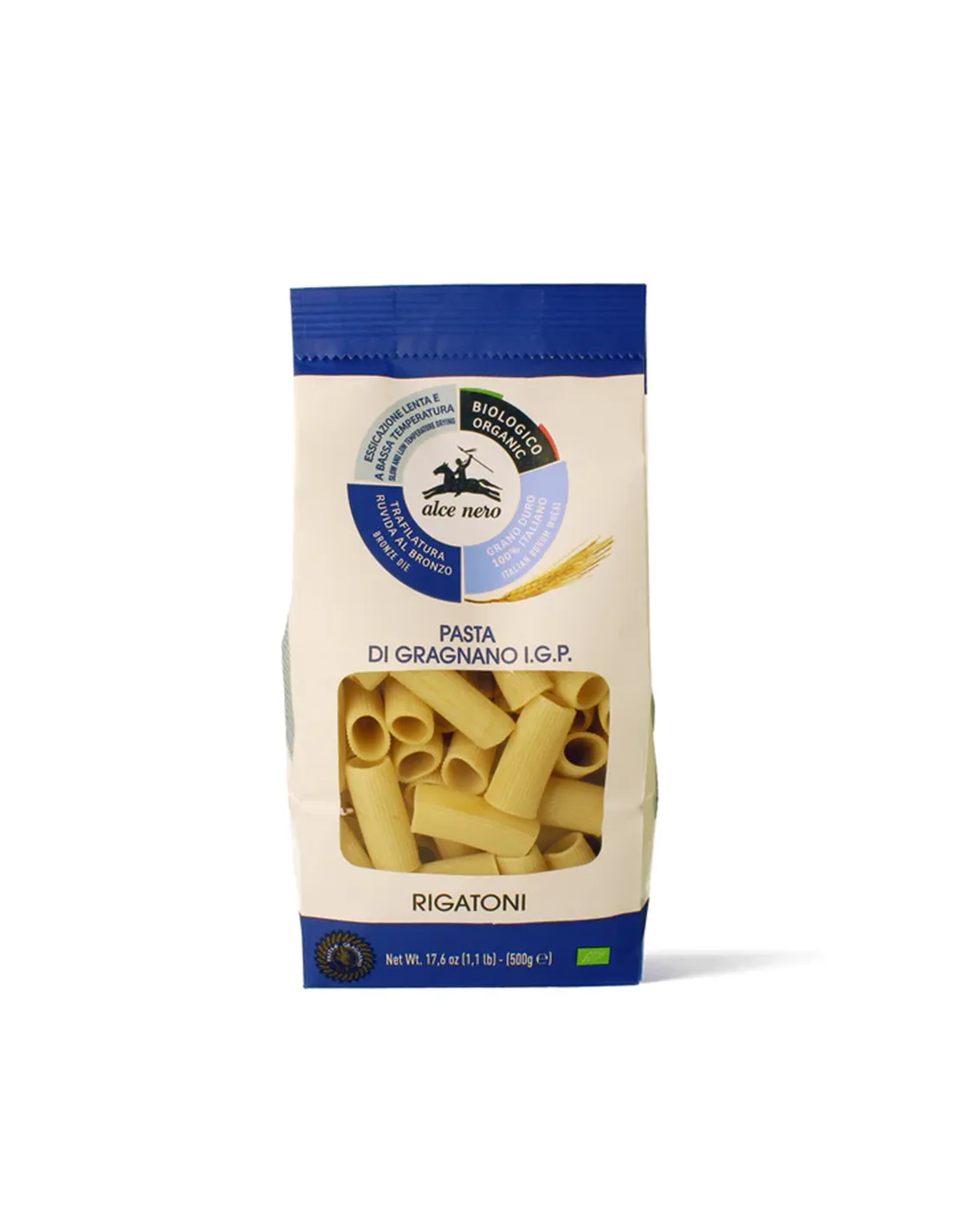 Rigatoni biologici di Gragnano, con la loro forma rigata e il sapore autentico, sono perfetti per accogliere sughi ricchi e corposi.