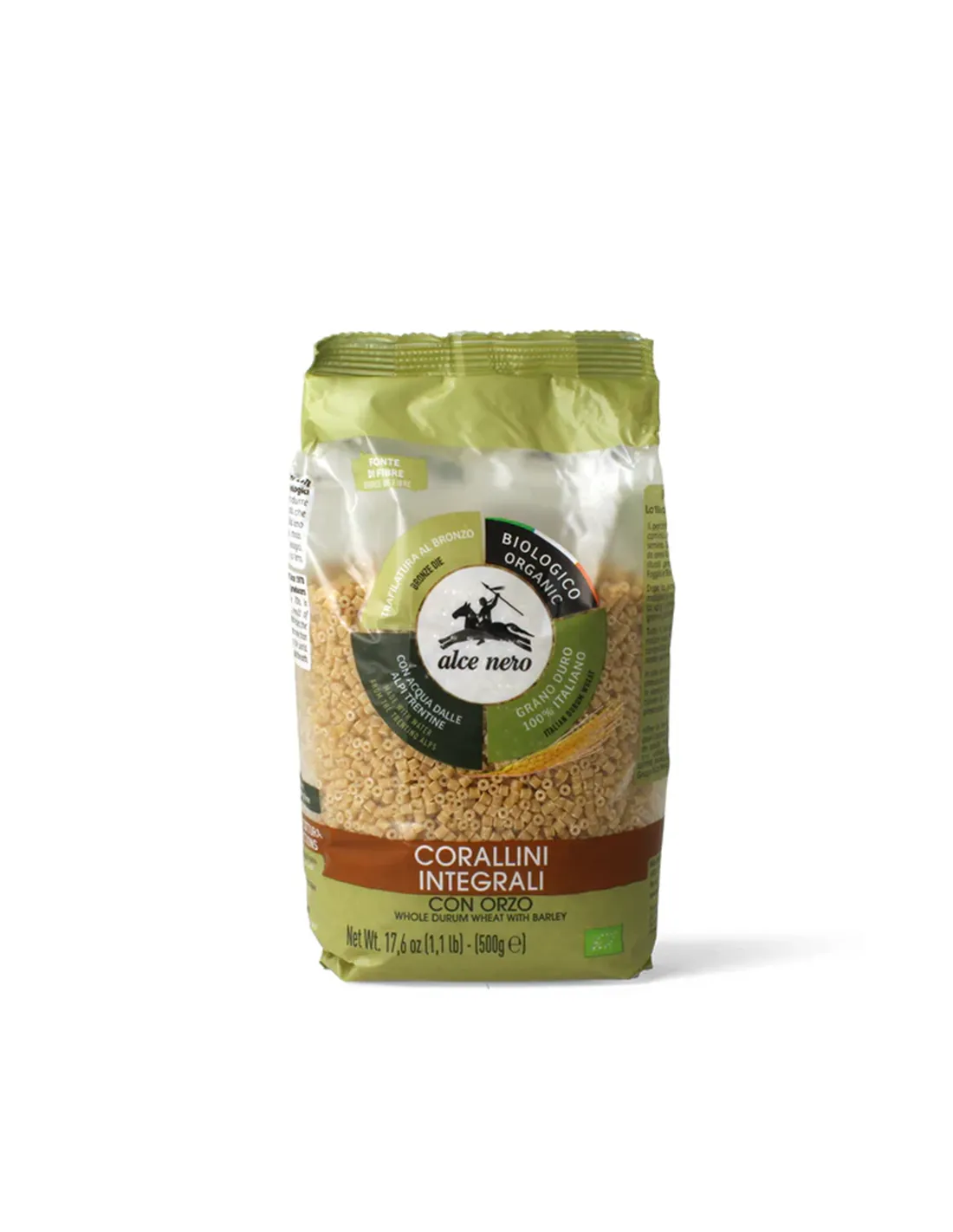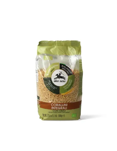 I corallini integrali con orzo bio Alce Nero sono prodotti con grani duri biologici coltivati in Italia.