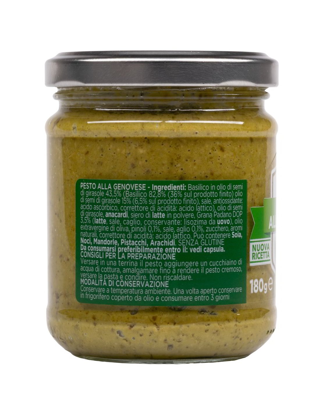 Basilico in olio di semi di girasole 43,5% (Basilico 82,8% (36% sul prodotto finito) olio di semi di girasole 15% (6,5% sul prodotto finito)), sale, antiossidante: acido ascorbico, correttore di acidità: acido lattico), olio di semi di girasole, anacardi, siero di latte in polvere, Grana Padano DOP 3,5% (latte, sale, caglio, conservante: lisozima da uovo), olio extravergine di oliva, pinoli 0,1%, sale, aglio 0,1%, zucchero, aromi naturali, correttore di acidità: acido lattico.