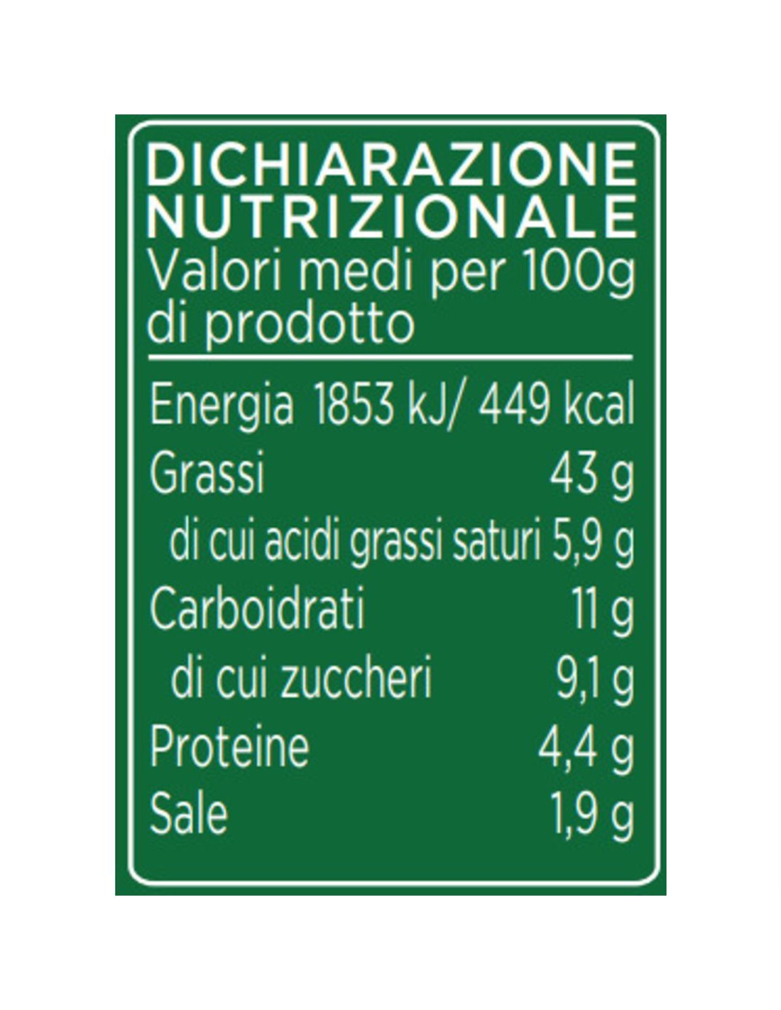 Energia: 1853 kJ/ 449 kcal | Grassi: 43 g | Saturi: 5,9 g | Carboidrati: 11 g | Zuccheri: 9,1 g | Proteine: 4,4 g | Sale: 1,9 g