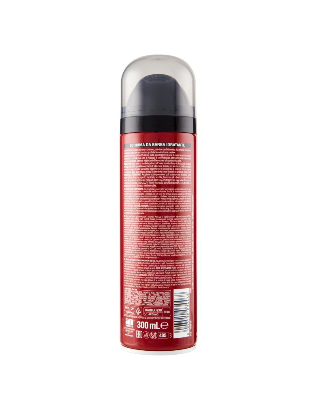 Modalità d'uso: Agitare bene la bombola prima dell'uso. Erogare sulle dita la quantità necessaria di schiuma e distribuirla sul viso bagnato con acqua tiepida. Massaggiare leggermente e procedere con la rasatura.
