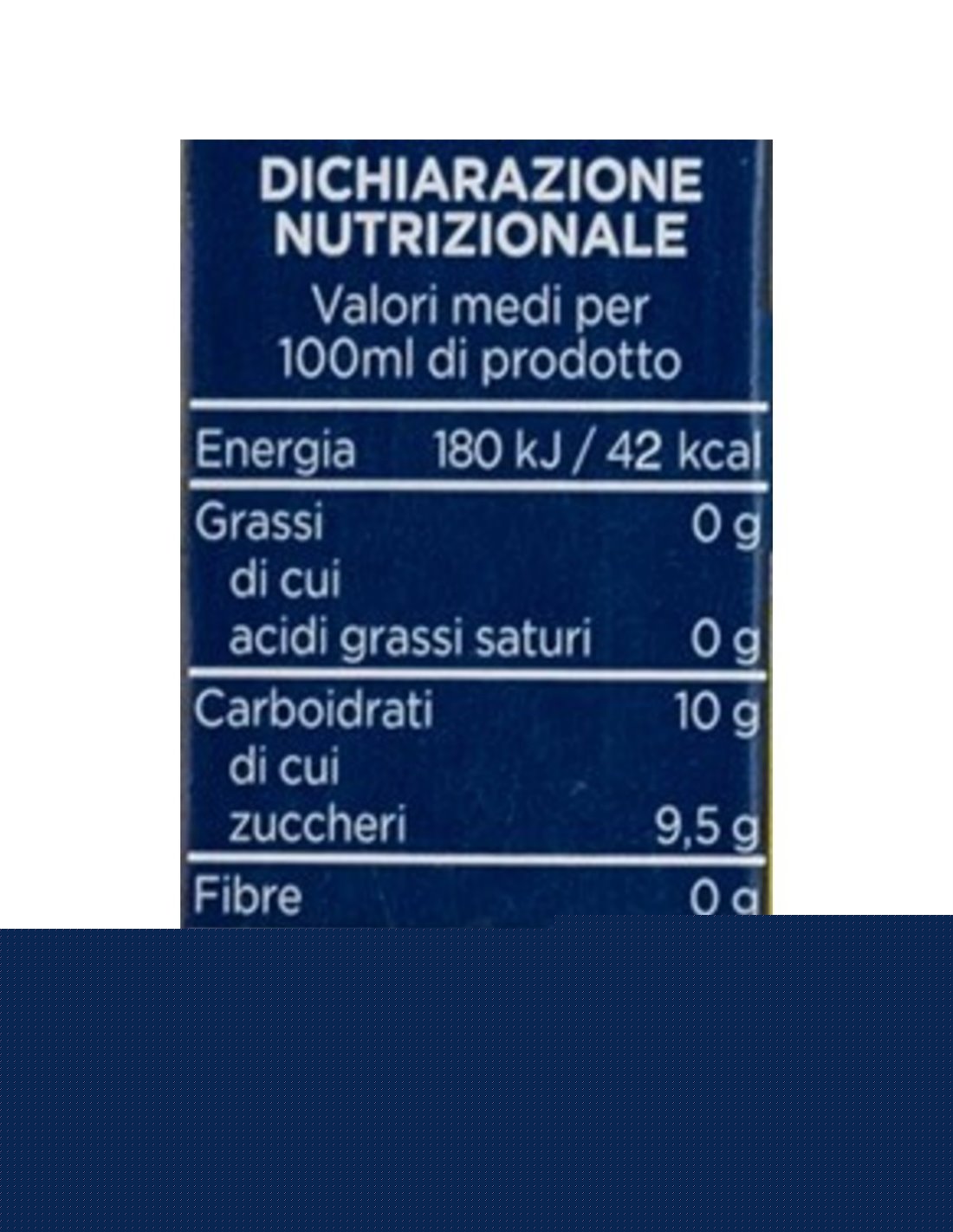 Energia: 180 kJ / 42 kcal | Grassi: 0 g | Saturi: 0 g | Carboidrati: 10 g | Zuccheri: 9,5 g | Fibre: 0 g | Proteine: 0,6 g | Sale: 0 g