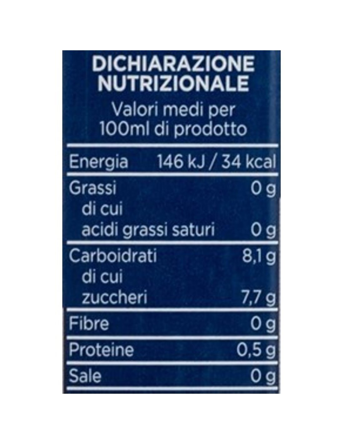 Energia: 146 kJ/34 kcal | Grassi: 0 g | Saturi: 0 g | Carboidrati: 8,1 g | Zuccheri: 7,7 g | Fibre: 0 g | Proteine: 0,5 g | Sale: 0 g
