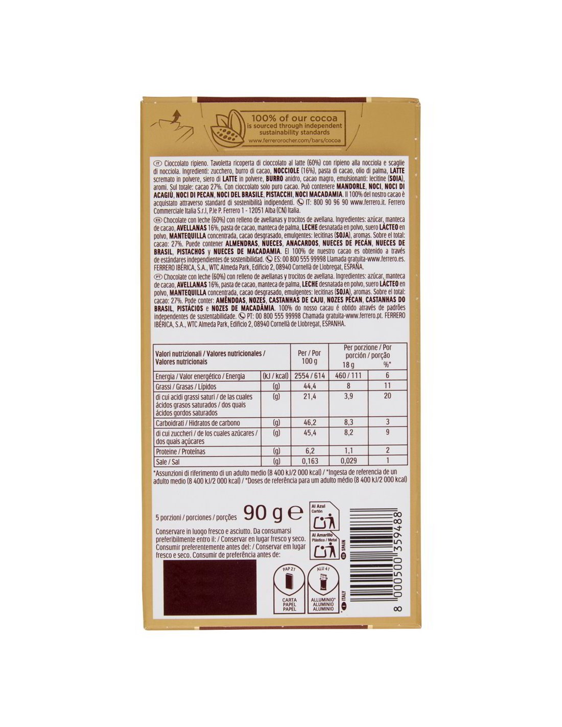 Contiene: latte, nocciola, soia. Può contenere: altri frutti a guscio (mandorla, pistacchio, noce), arachidi.